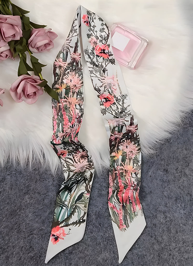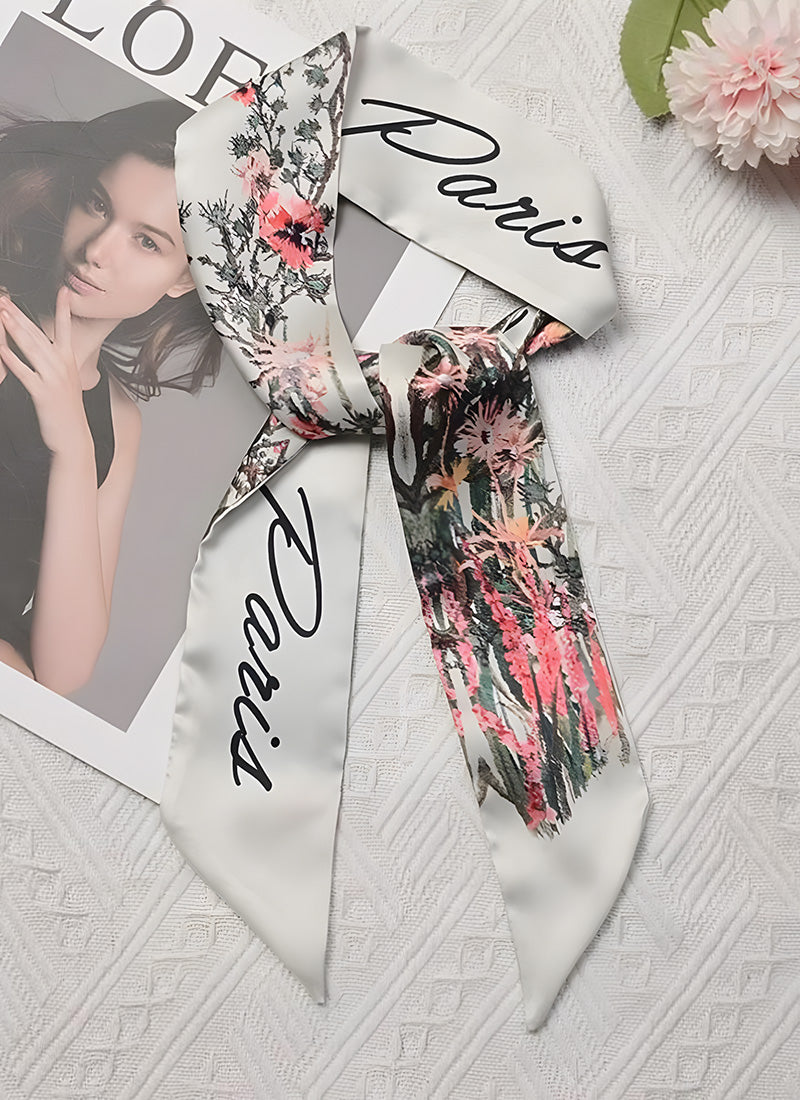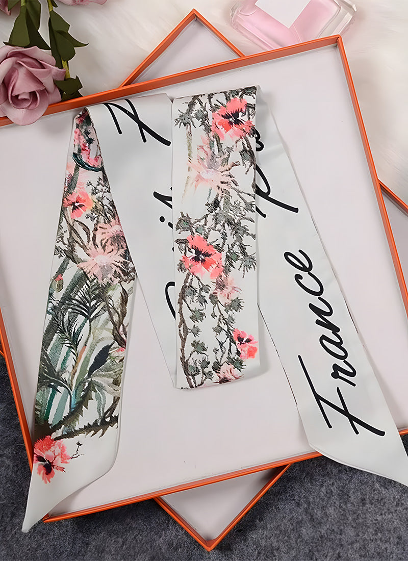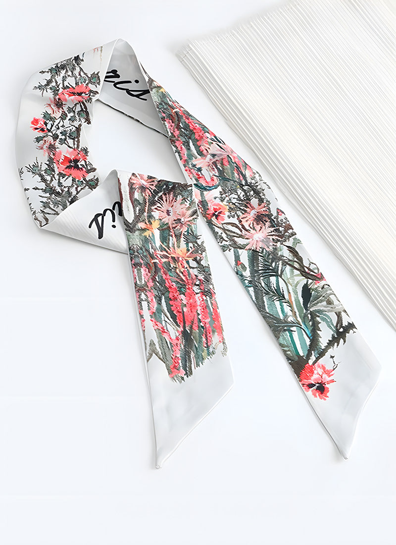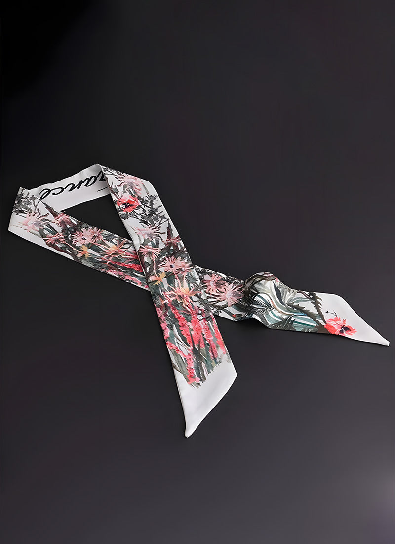 軽やかなポリエステル素材で仕上げた、シルクのような光沢と滑らかな肌触りが魅力のファッションスカーフ。春の柔らかな風、夏の日差し、秋の穏やかな空気にぴったりな一本です。