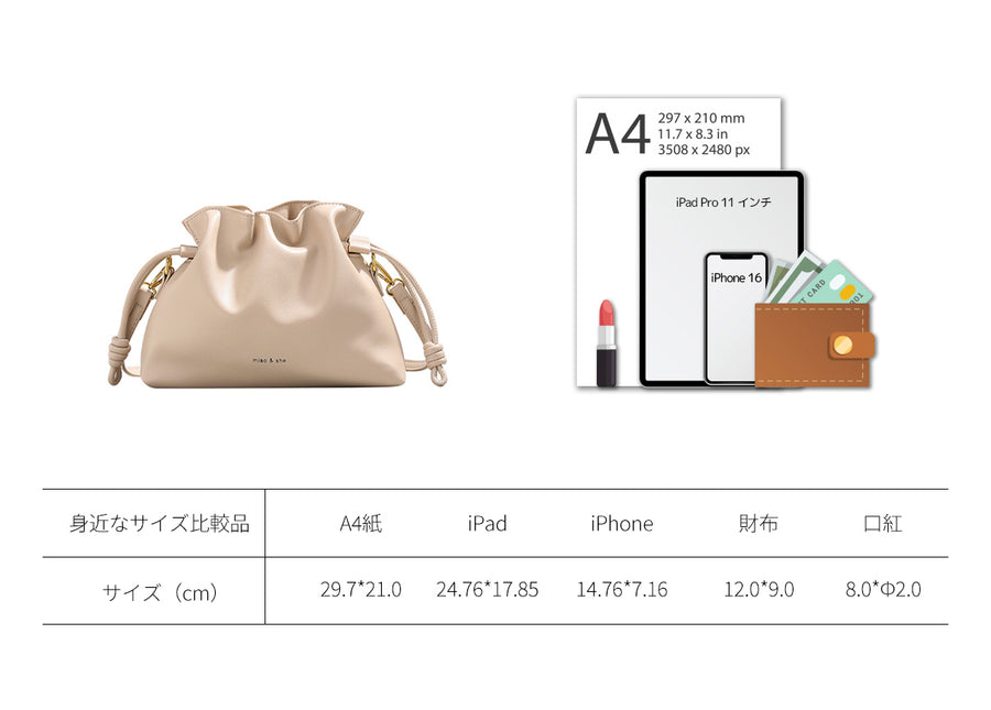 福袋のようなデザインと滑らかな質感が魅力のショルダーバッグ