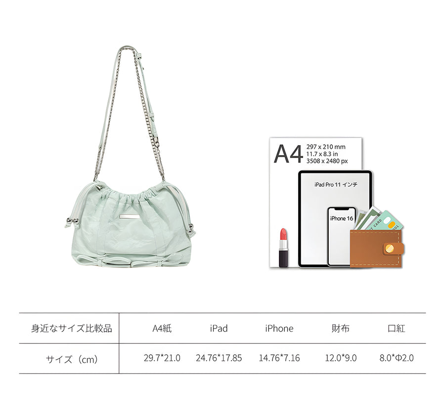 シルバーチェーンのアクセントが一層洗練された印象を与え、どんなシーンにもフィットします。