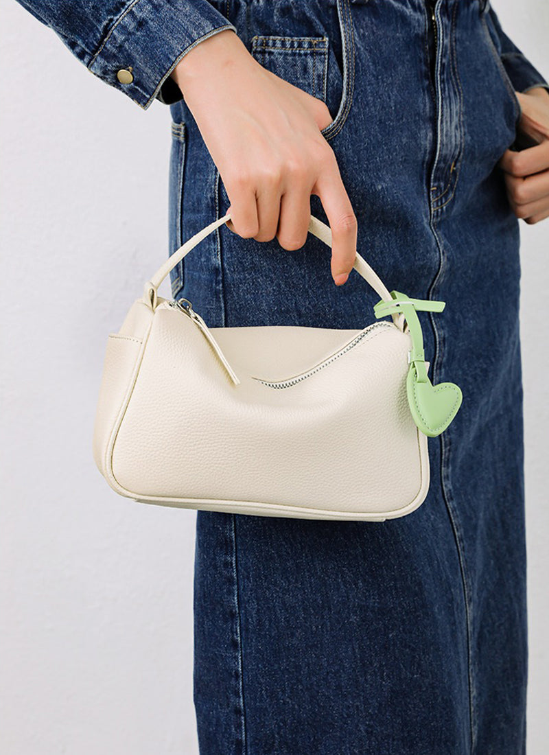 ミニサイズながらも収納力があり、携帯や財布、ハンカチなど必要な物がしっかり入ります。クリームホワイトの色合いも上品で、緑のハートチャームがアクセントになっていてとても可愛いです。素材が柔らかくて手触りが良く、ファスナーも滑らかで使いやすいです。