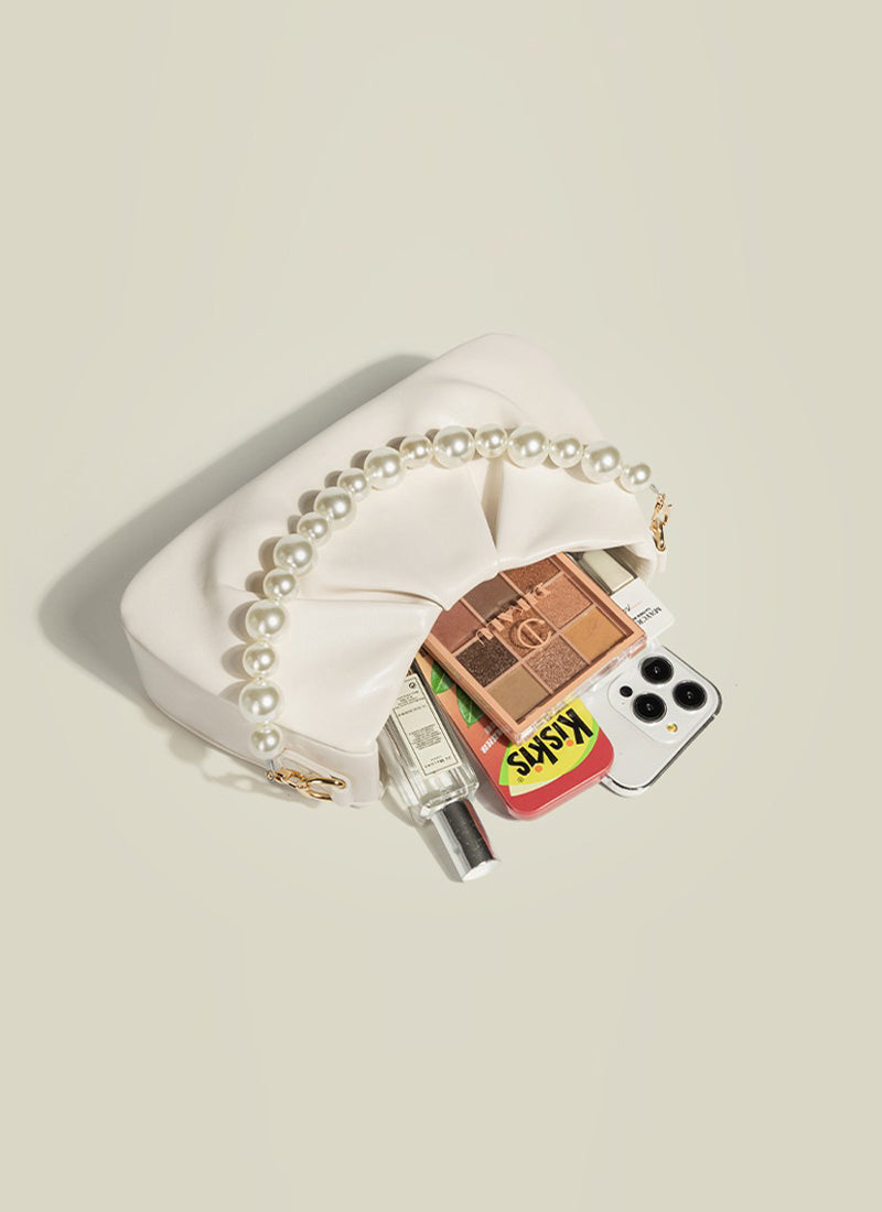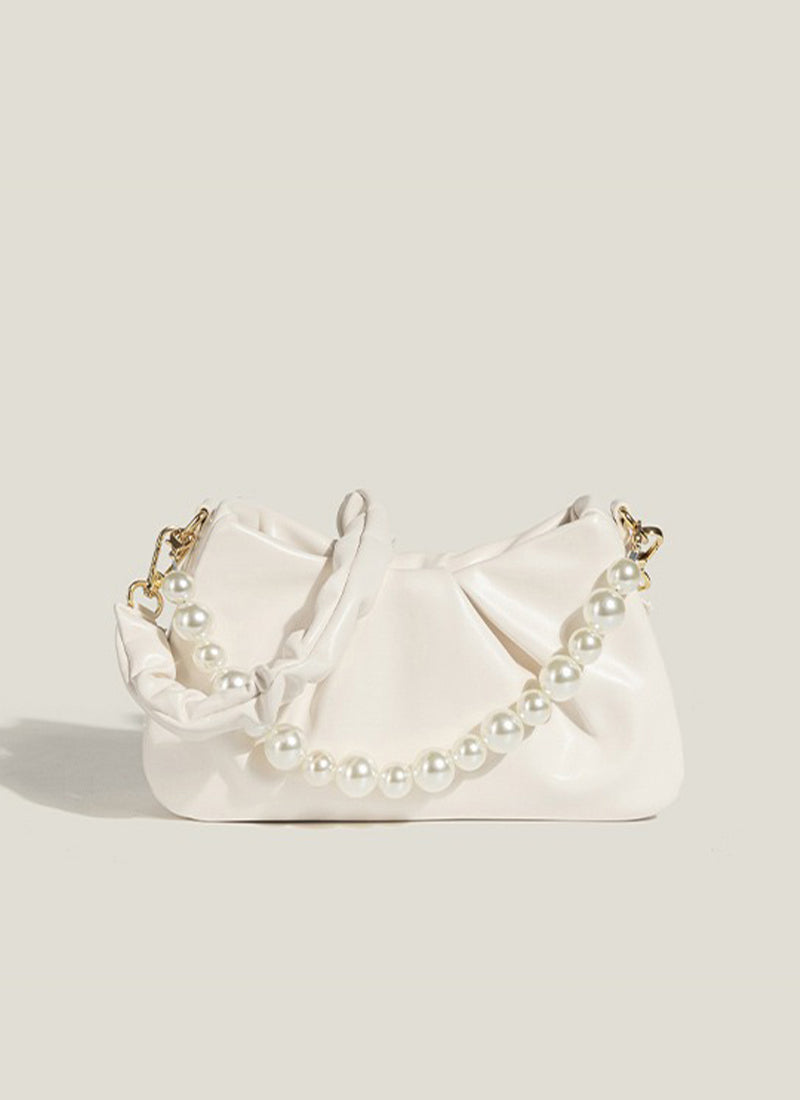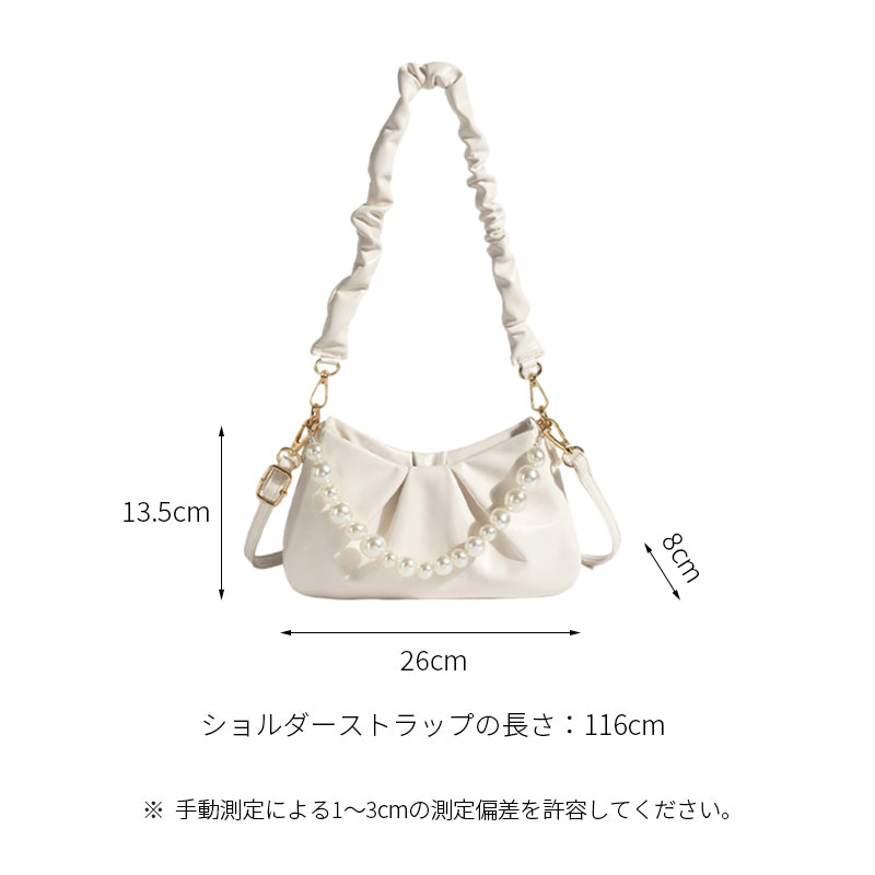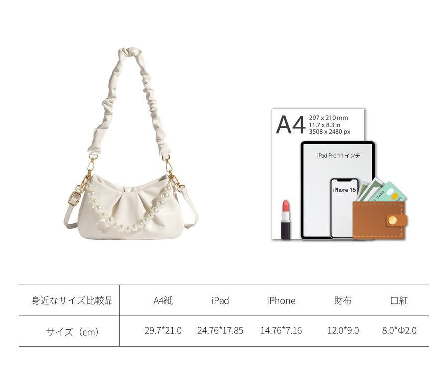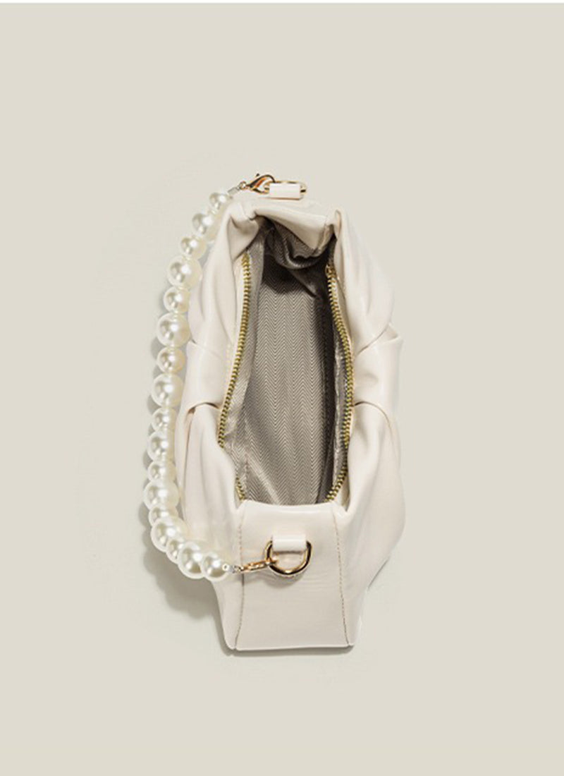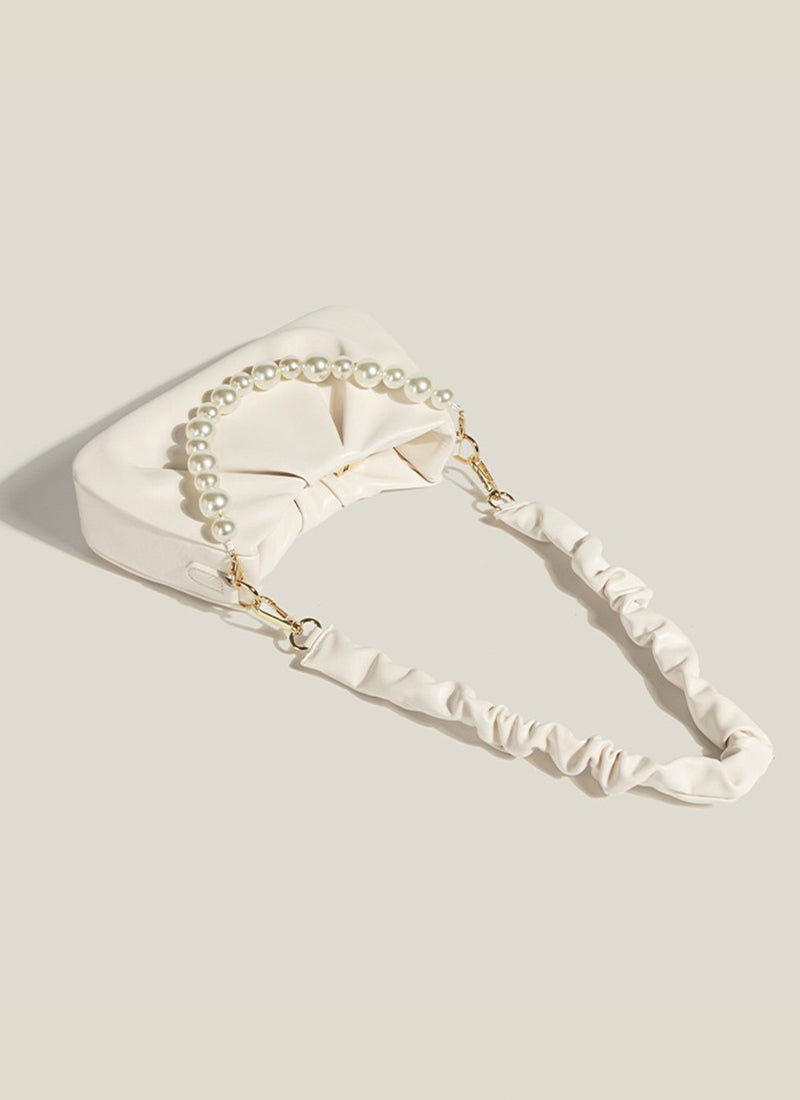 しっとりスムースなPUレザーに、輝くパールストラップがアクセントとなり、シンプルながらも高級感のある佇まいを引き立てます。