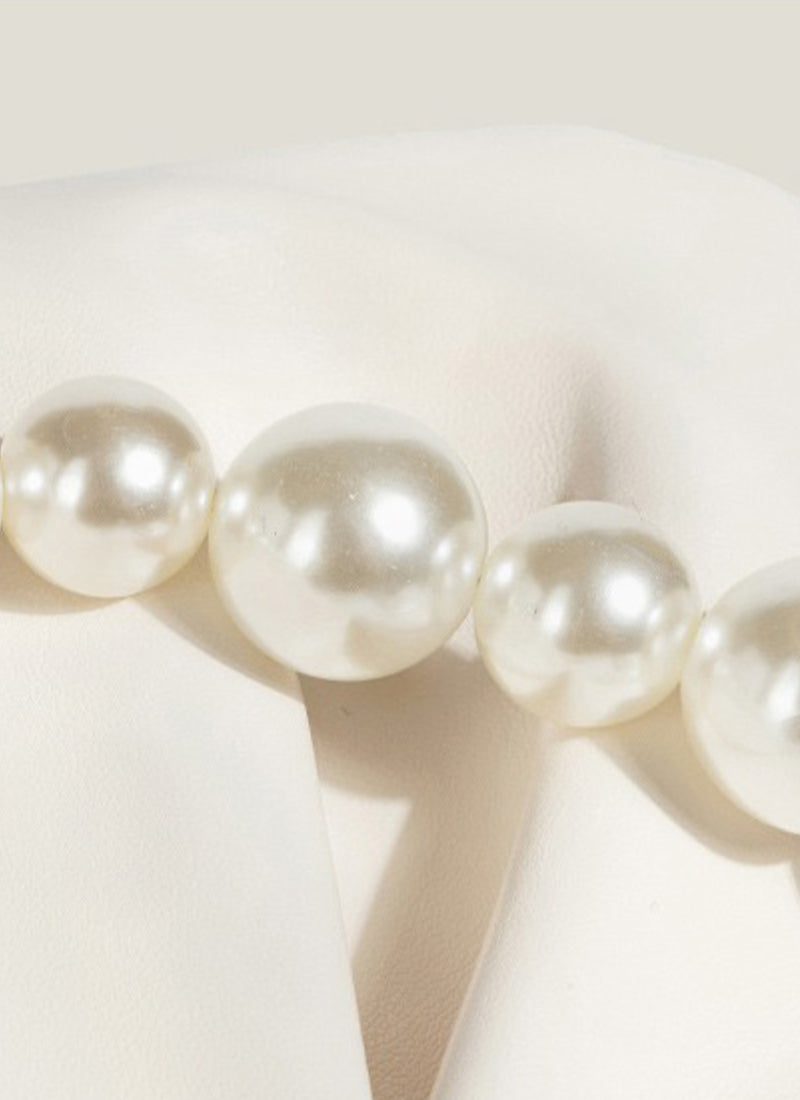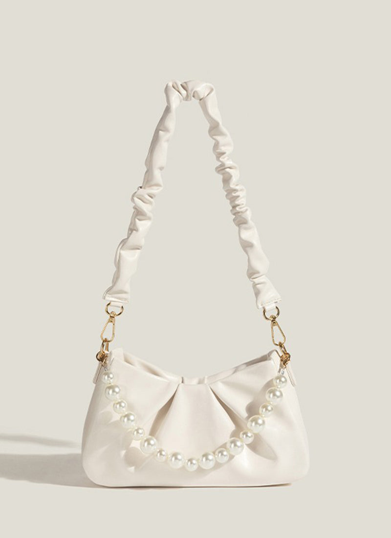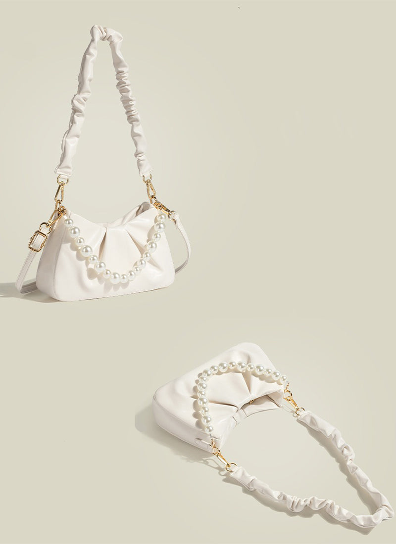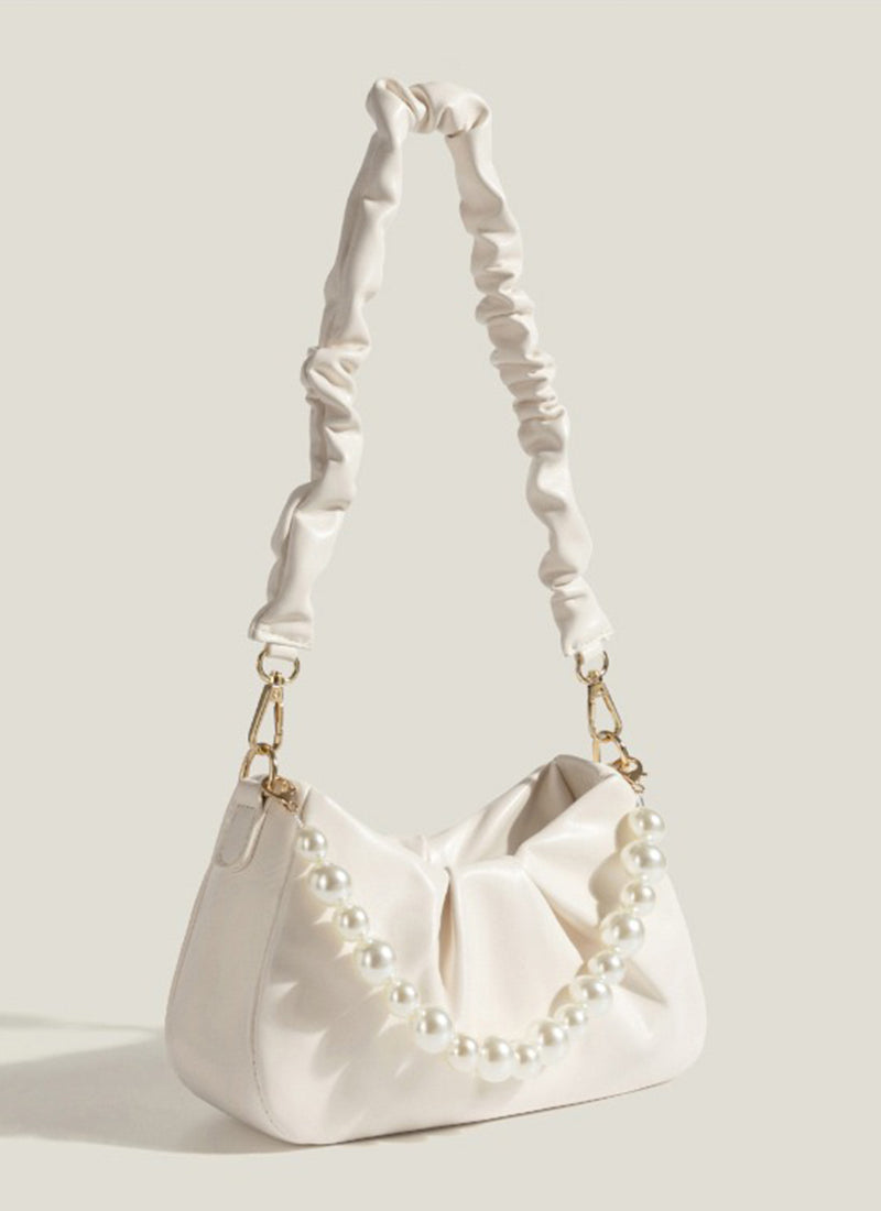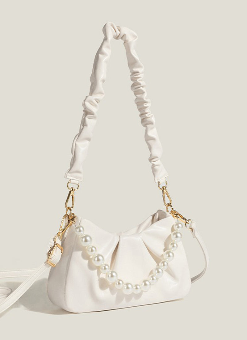 しっとりスムースなPUレザーに、輝くパールストラップがアクセントとなり、シンプルながらも高級感のある佇まいを引き立てます。