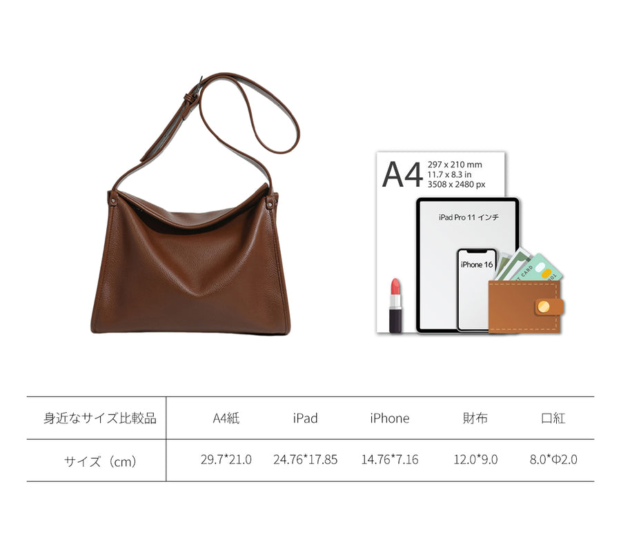 肩掛けにもハンド持ちにも対応し、シーンに合わせてスタイルを変えられます。\オフィス、カフェ、お出かけなど、日常のどんな瞬間にも自然と馴染む、大人のための万能ショルダーバッグです。