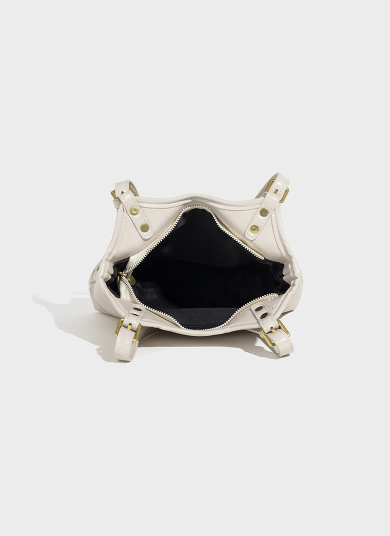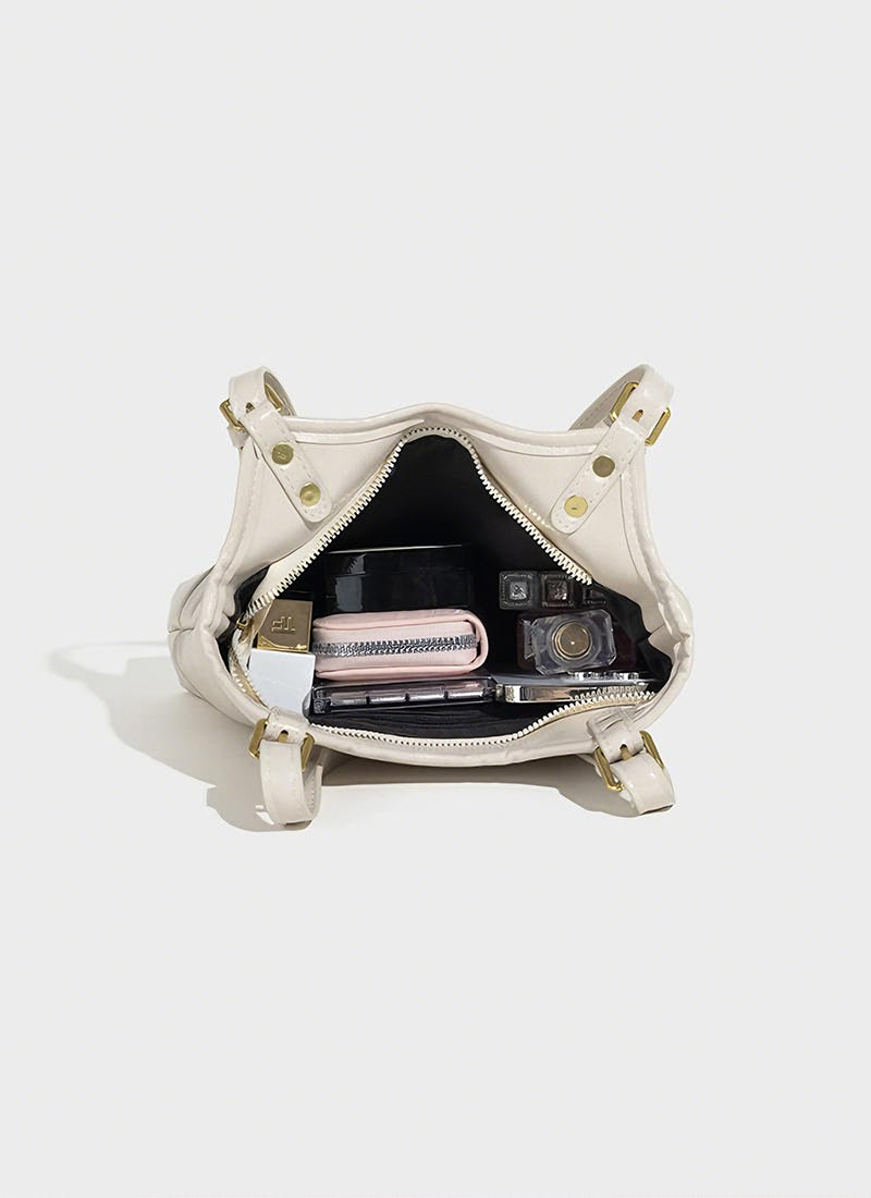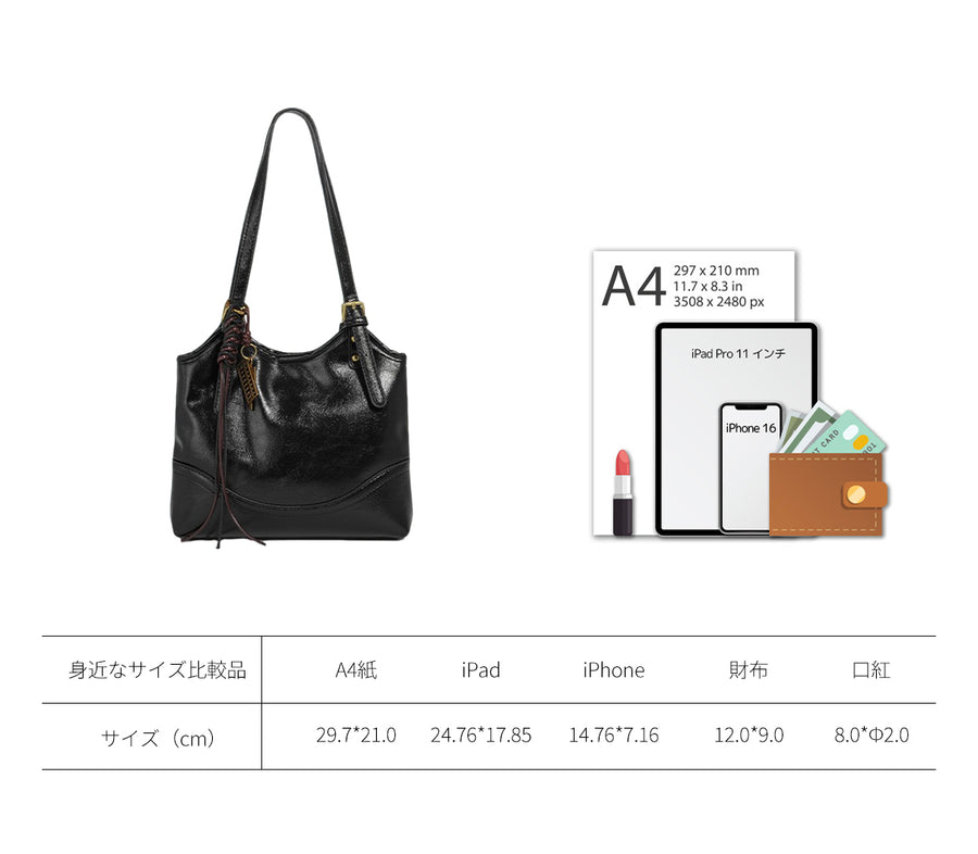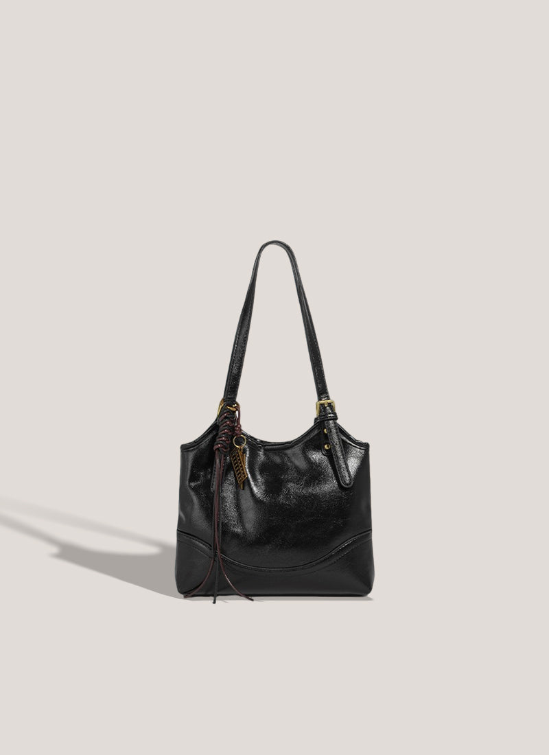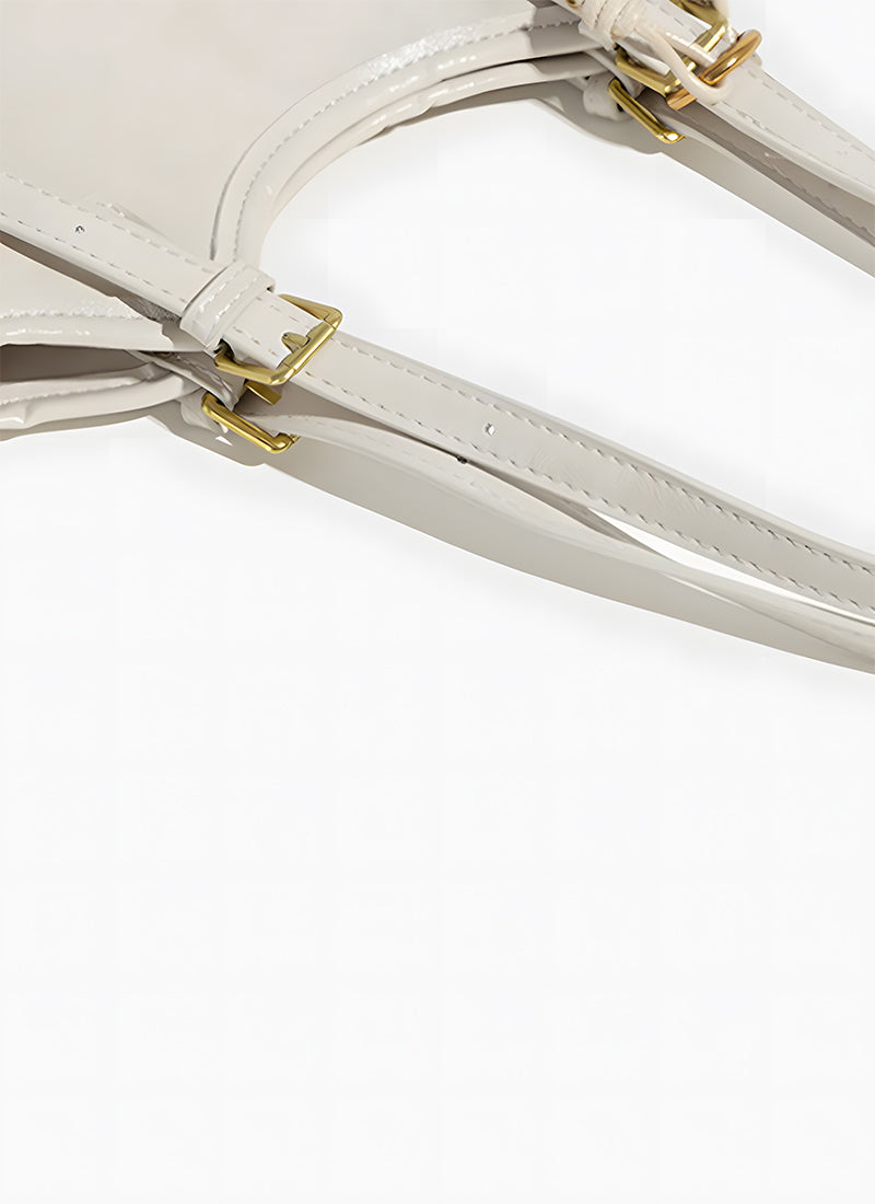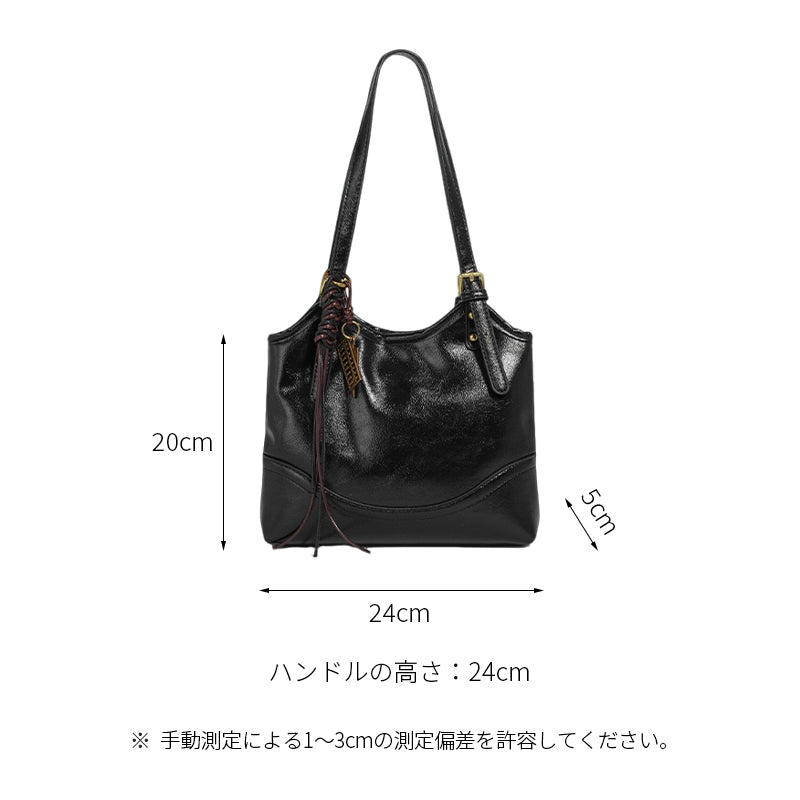 艶めくPUレザーが光を受けて揺らめくたび、控えめなサイズながら鋭い存在感を放ちます。