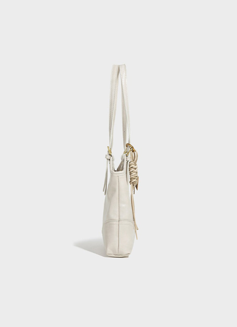 ミニマルなシルエットに、編み紐チャームと金具ディテールがアクセントとして際立つ表情。